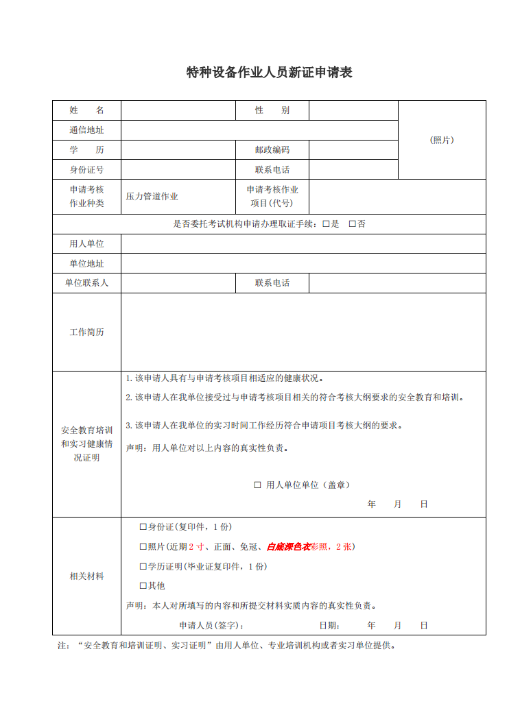 1、參加培訓人員如實填寫特種設備作業考試申請表1份;